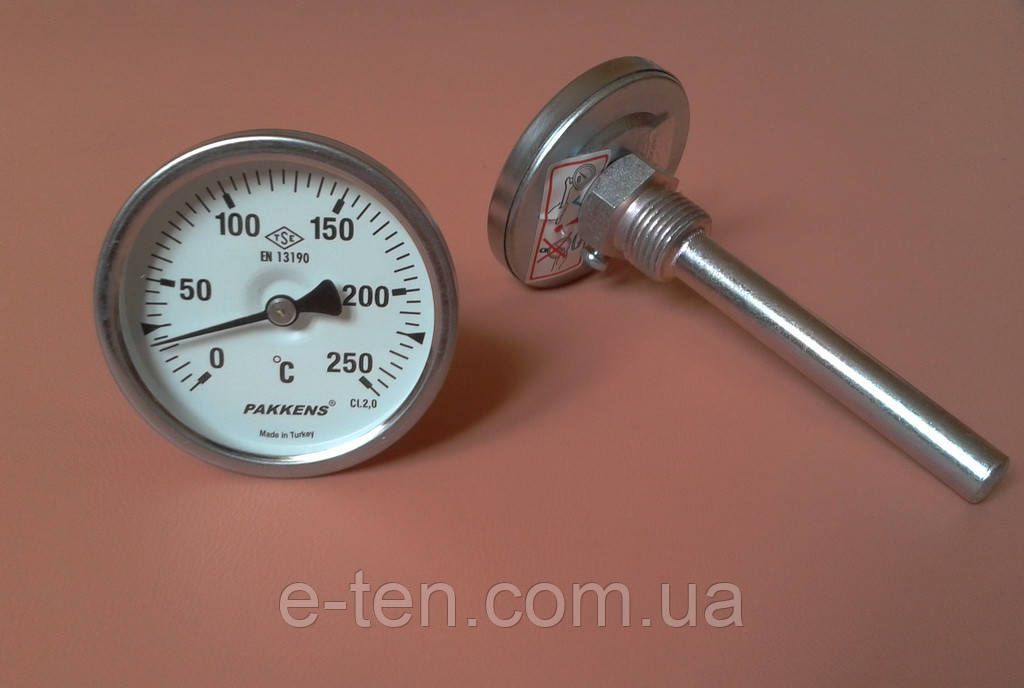 Термометр осьовий біметалевий осьовий трубчастий PAKKENS діаметром Ø63мм з діапазоном вимірюваної температури від 0 до 250°С, гильза L = 100 мм. Призначений для вимірювання температури в будь-якому місці, де це потрібно (системи опалення, сауни, коптильні, у промисловому виробництві тощо), за допомогою зовнішнього капіляра — у цьому разі капіляр є в осьовій гільзі завдовжки 100 мм, на якій є різь 1/2" (полдюйма) ― см.ФОТО.